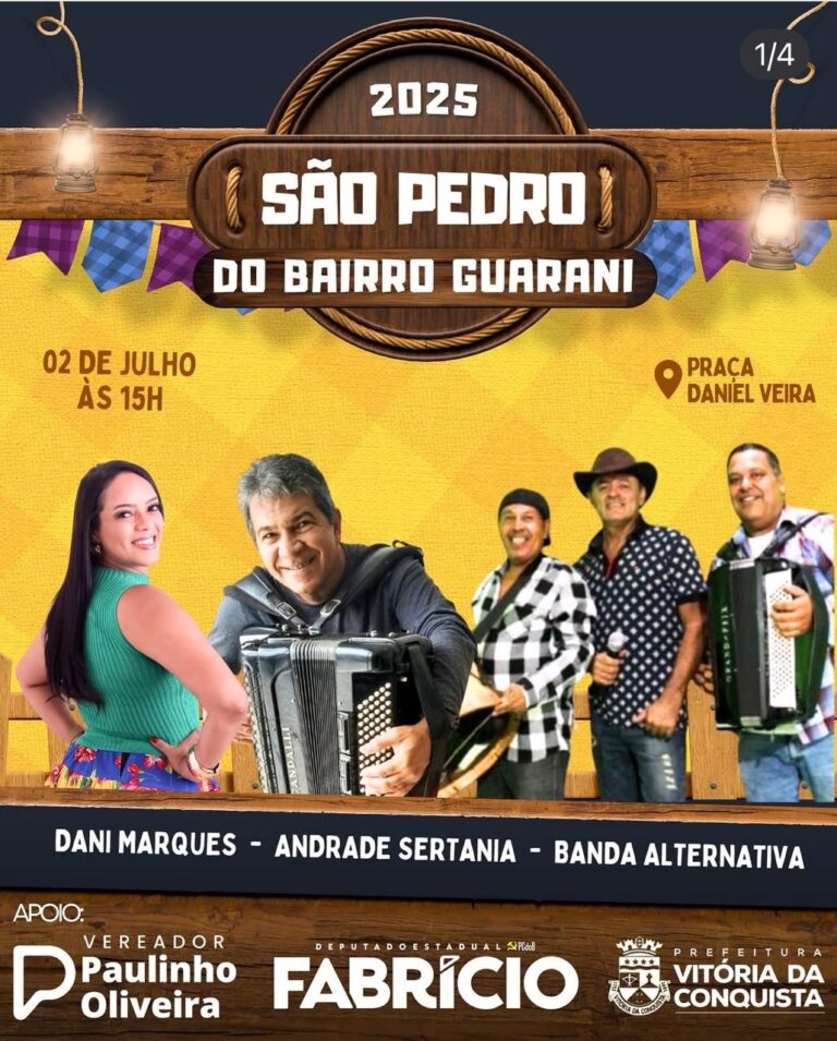 A tradição junina segue firme em Vitória da Conquista. No dia 2 de julho, o Bairro Guarani será palco de mais uma edição do São Pedro, que promete movimentar a Praça Daniel Vieira com uma programação especial recheada de música, alegria e cultura popular.