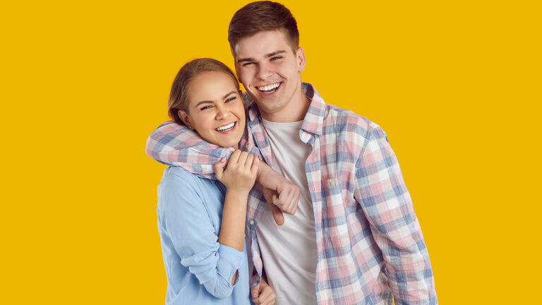 casal de jovens abraçados e sorrindo em fundo amarelo