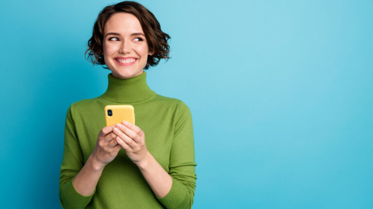 à esquerda está uma mulher vestindo verde sorrindo e com um celular na mão em fundo azul