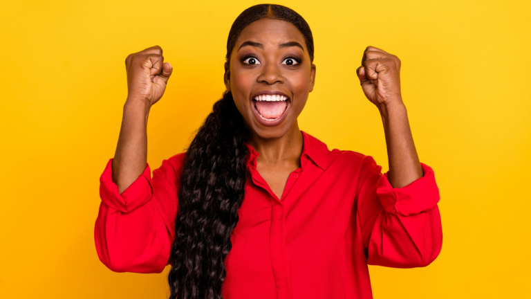 Mulher adulta sorrindo com expressão de entusiasmo, usando camisa vermelha, levanta os dois punhos fechados em sinal de comemoração. Ela está em frente a um fundo amarelo liso, transmitindo alegria, conquista e empoderamento.