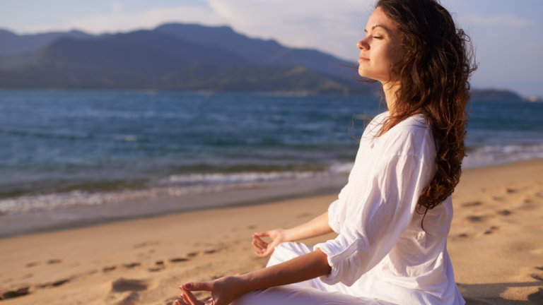 Mulher adulta sentada na areia da praia, de olhos fechados, pratica meditação com as mãos apoiadas sobre as pernas. Ela veste roupas brancas leves, enquanto o mar e montanhas aparecem ao fundo, transmitindo sensação de calma, equilíbrio e conexão com a natureza.