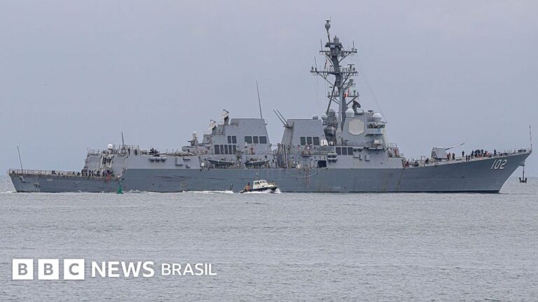 Legenda da foto, O navio de guerra americano Sampson foi visto em um porto no Panamá na terça-feira.