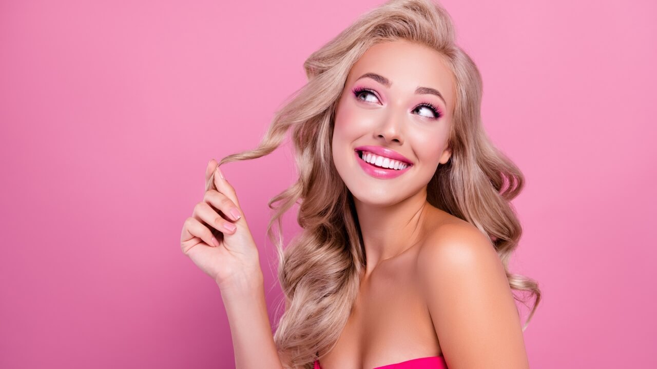 Foto de uma mulher em um fundo rosa.