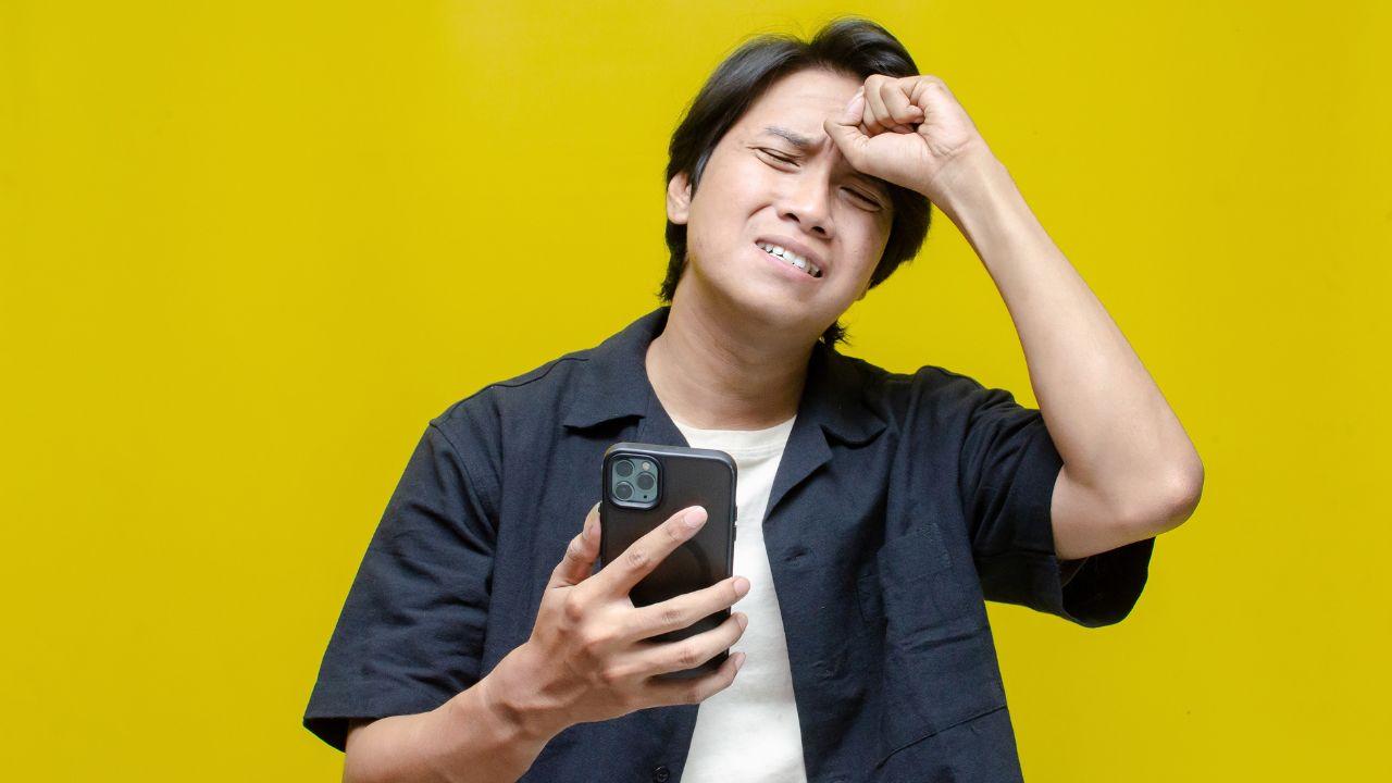Imagem de um homem asiático, com o celular em uma mão e a outra na testa, lamentando