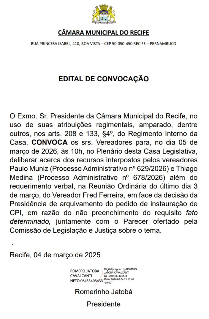 De acordo com o edital de convocação, a sessão foi marcada para esta quinta (5), às 10h, no plenário da Casa de José Mariano. Na ocasião, os vereadores vão apreciar os recursos apresentados por Paulo Muniz (PL) e Thiago Medina (PL), além de um requerimento verbal feito em plenário pelo vereador Fred Ferreira (PL).