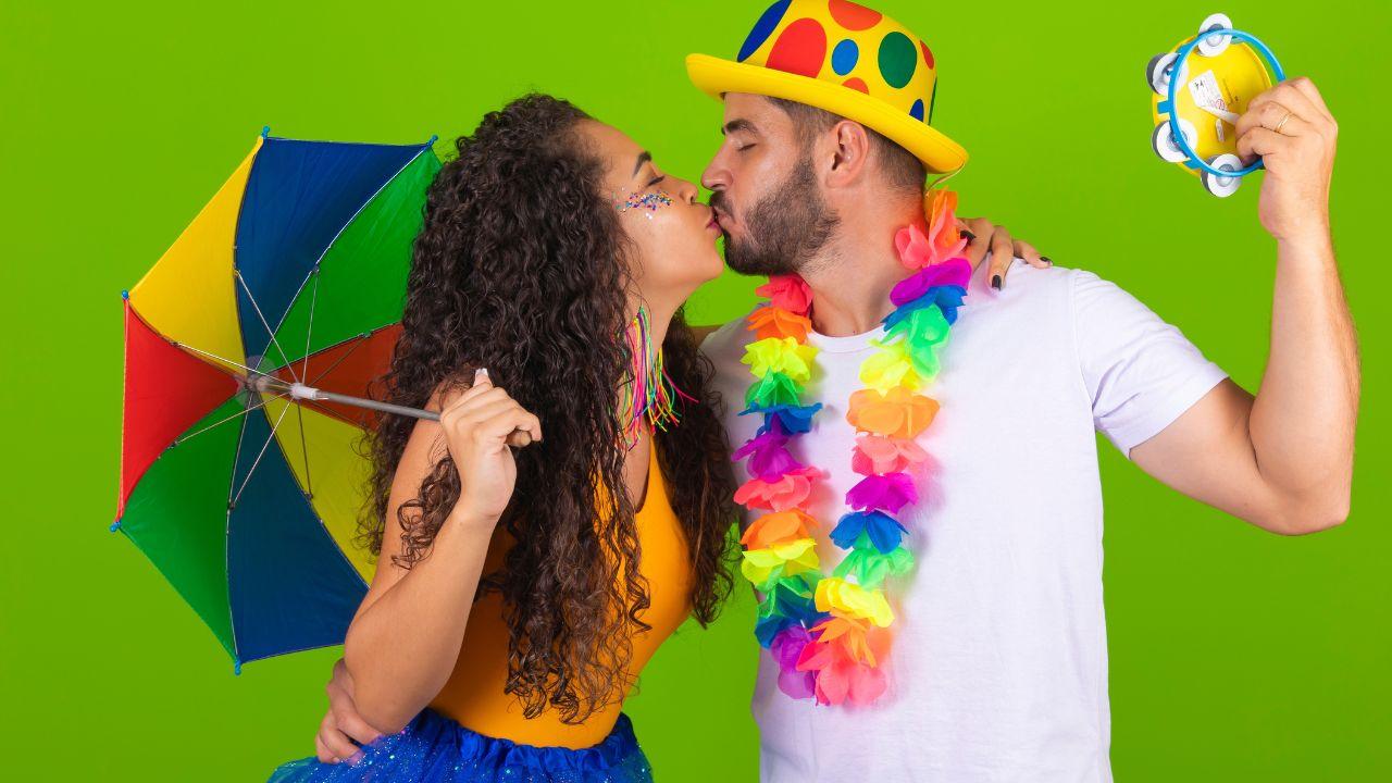 Mulher negra, cabelo cacheado longo e solto, beijando um homem branco de lado em um fundo verde e eles usam roupas coloridas de carnaval.