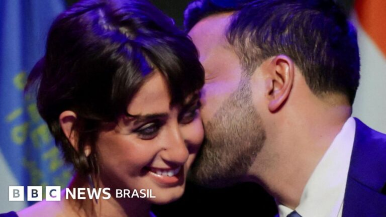 Zohran Mamdani beija a esposa Rama Duwaji, depois de vencer a eleição para prefeito de Nova York, nos Estados Unidos