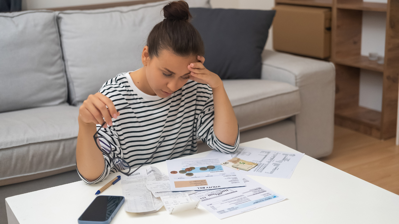 Imagem de uma mulher sentada olhando para as contas em cima da mesa