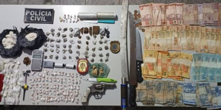 Drogas e dinheiro apreendido pela polícia.