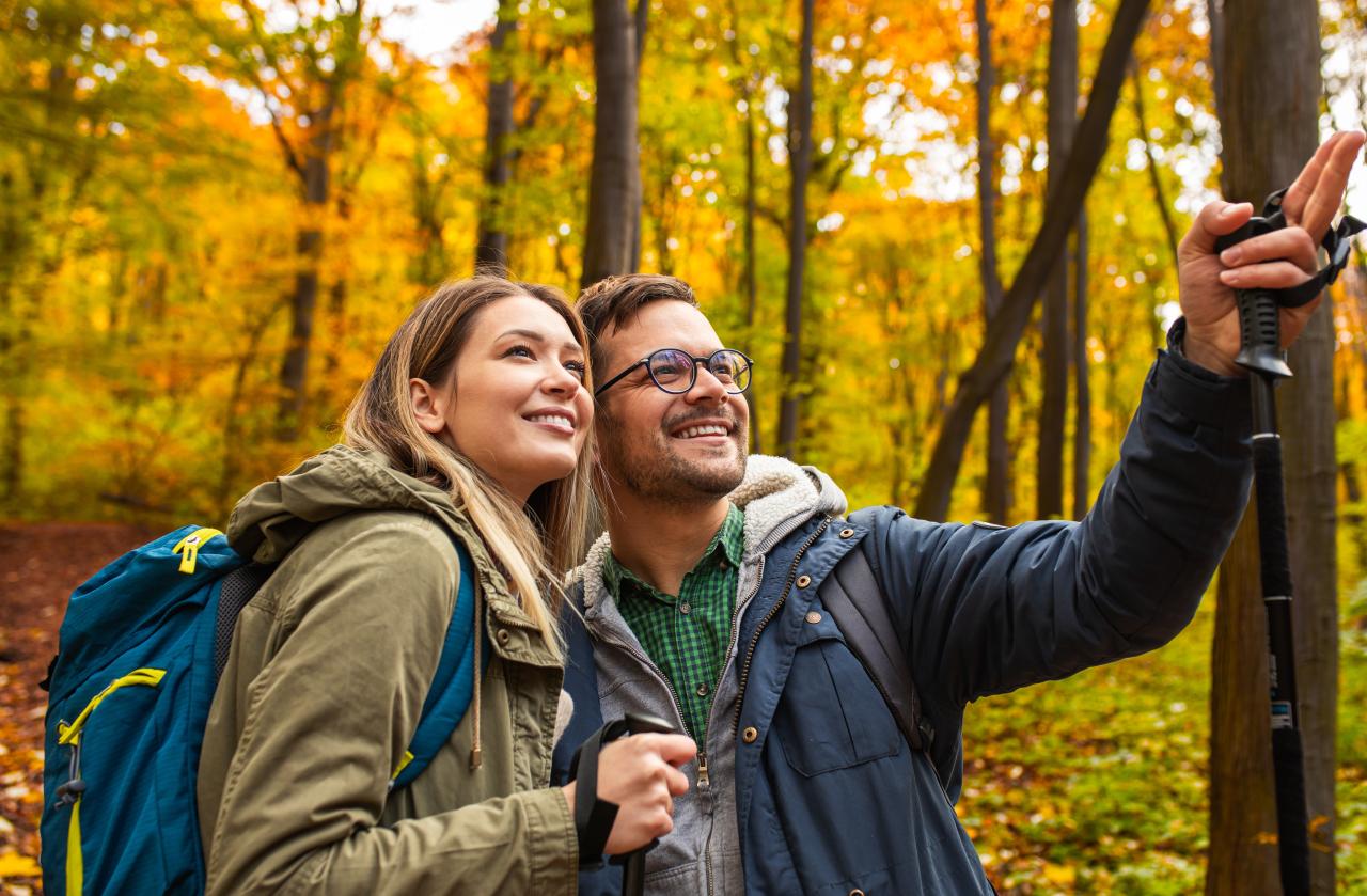 Mulher e homem na floresta conversando.