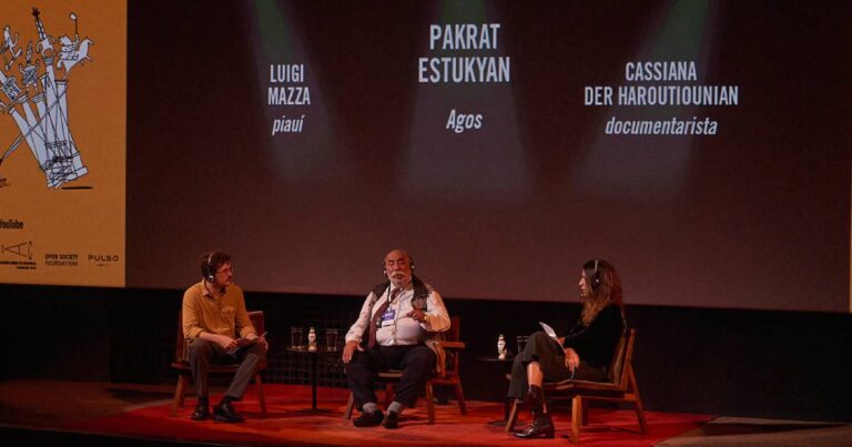 Estukyan foi entrevistado no palco pelo editor do site da piauí Luigi Mazza e pela documentarista e artista visual Cassiana Der Haroutiounian. Assim como Dink, ele é turco de família armênia. Seus quatro avós foram sobreviventes do genocídio, que é tema recorrente nos artigos publicados pelo jornal. Ele contou como o Agos, apesar das ameaças e da antipatia expressa do governo turco, ainda consegue se manter em pé. O jornal, de pequeno porte, é financiado pela família de Dink e, segundo o editor, tem uma circulação de aproximadamente 4 mil exemplares por semana. Por meio de seu site, no entanto, alcança um público maior, com análises políticas publicadas em turco, armênio e também em inglês.