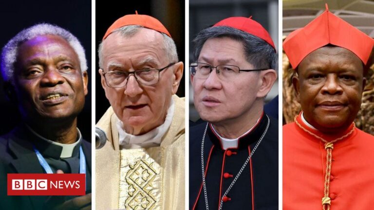 Legenda da foto, Candidatos ao papado (da esquerda para a direita): cardeal Peter Kodwo Appiah Turkson, cardeal Pietro Parolin, cardeal Luis Antonio Gokim Tagle e cardeal Fridolin Ambongo Besungu