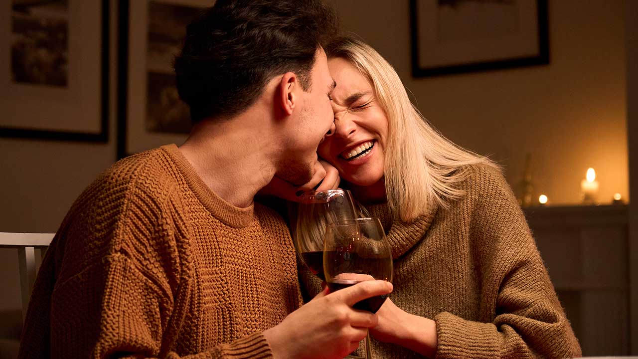 casal sentado em uma mesa rindo com taças de vinho