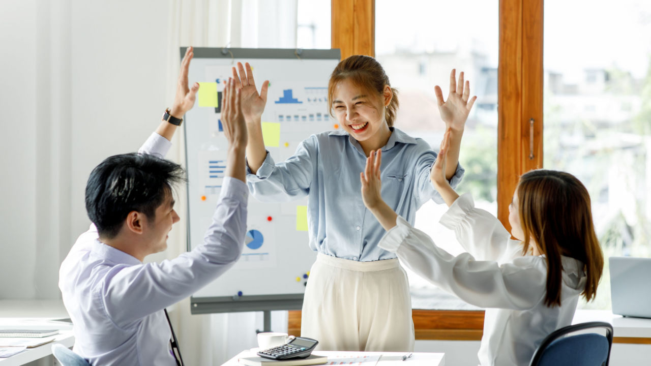 mulher tocando na mão de dois colegas de trabalho em um escritório