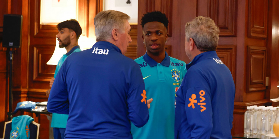 Carlo Ancelotti e Luigi Vito cumprimentam Vinícius Jr. no hotel da Seleção em Londres
