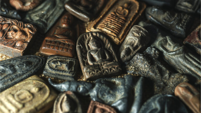 Amuletos tailandeses em uma grande variedade de estilos; amuletos de Buda.