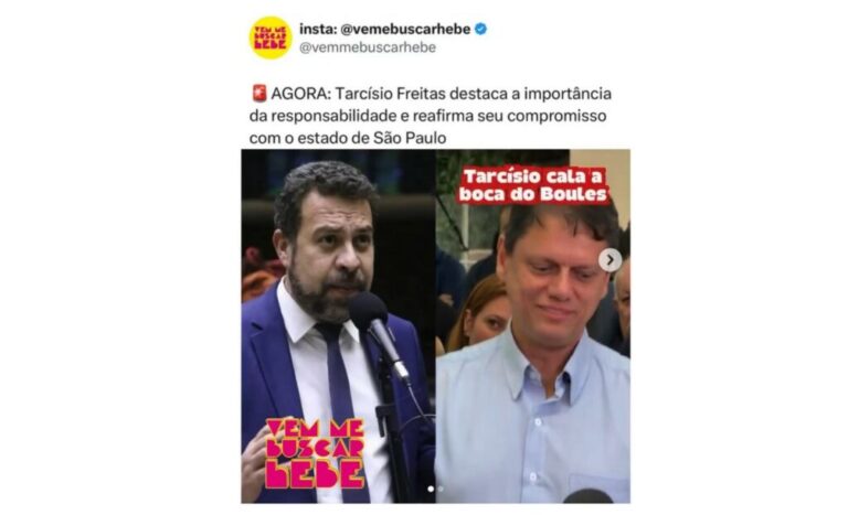 O @vemebuscarhebe, com 1,1 milhão de seguidores, fez um post cuja pauta consistia em enaltecer o governador. Dizia o texto: “Tarcísio de Freitas destaca a importância da responsabilidade e reafirma seu compromisso com o estado de São Paulo.” Traz uma foto de Guilherme Boulos ao lado de um vídeo do governador dizendo que se preocupa com comunidades carentes. O perfil coloca a legenda no vídeo do governador: “Tarcísio cala a boca de Boules”, ironizando o nome neutro. Uma piada anti-woke curiosa para um perfil que se insere na chamada gay culture: dias atrás destacou o sucesso do reality de internet Corrida das Blogueiras, sucesso queer, e mostrou um aspirante musculoso ao Big Brother Brasil sem camisa com a pergunta: “Fariam?” (ficariam com ele?).