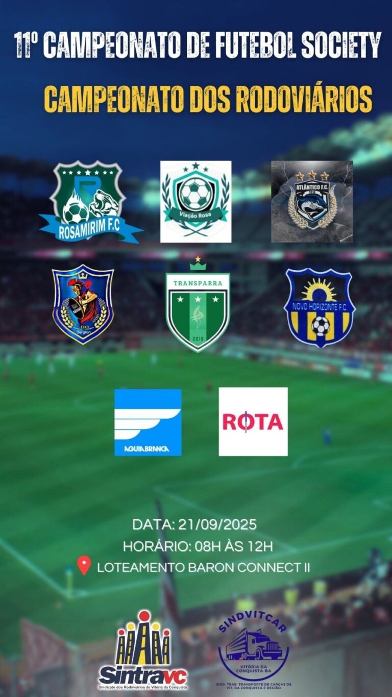 Vitória da Conquista se prepara para receber mais uma edição de um dos eventos esportivos mais tradicionais da cidade. No próximo dia 21 de setembro, será realizado o 11º Campeonato de Futebol Society dos Rodoviários, reunindo atletas, torcedores e famílias em uma manhã marcada pelo espírito esportivo e pela confraternização da categoria.