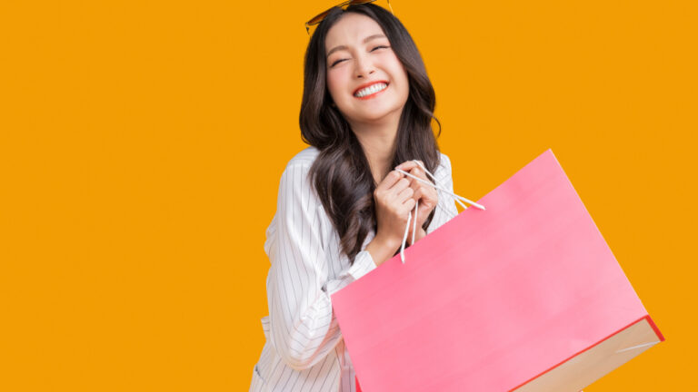 mulher com traços asiáticos sorrindo enquanto segura sacolas de comprar em vendo amarelo
