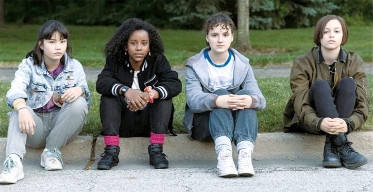 O tempo como um compact disc pulando faixas, de Madonna para um hit de Billie Eilish, sussurrando sobre amores que não cabem em 140 caracteres e nem num telegrama. Elas pedalando por vias onde carros voavam sem motor. E no meio do caos interdimensional, com portais se abrindo cuspindo caçadores do futuro atrás da versão feminina dos Goonies, o que brilha mesmo é a teia invisível da amizade de quatro preteens espertas de 12 anos. ]