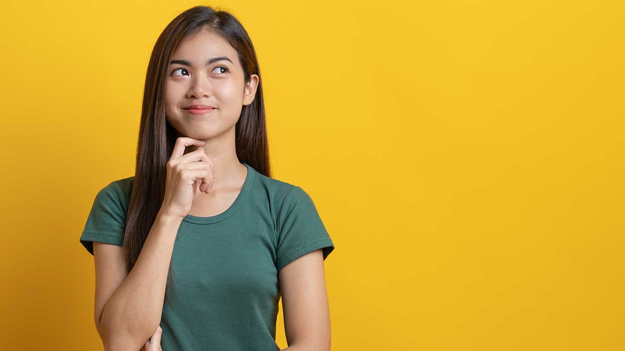 mulher olhando para o lado com a mão no queixo em fundo amarelo