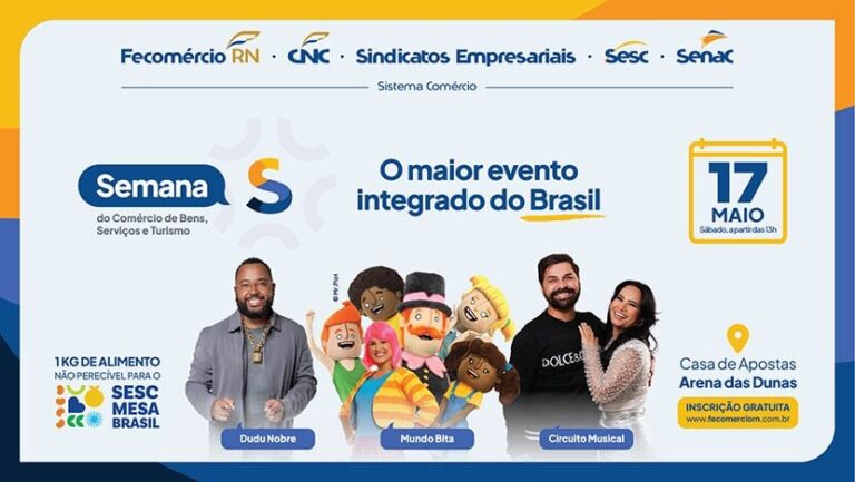 Seguem abertas as inscrições gratuitas para a Semana S do Comércio de Bens, Serviços e Turismo, promovida em nove cidades do estado pelo Sistema Fecomércio RN, Sesc e Senac. Os interessados podem garantir sua vaga pelo site da Fecomércio RN (fecomerciorn.com.br), assegurando acesso a toda a programação, que acontece de 12 a 17 de maio em diversos pontos de Natal, Mossoró, Assú, Caicó, Currais Novos, Macaíba, Nova Cruz, São Paulo do Potengi e Santa Cruz.