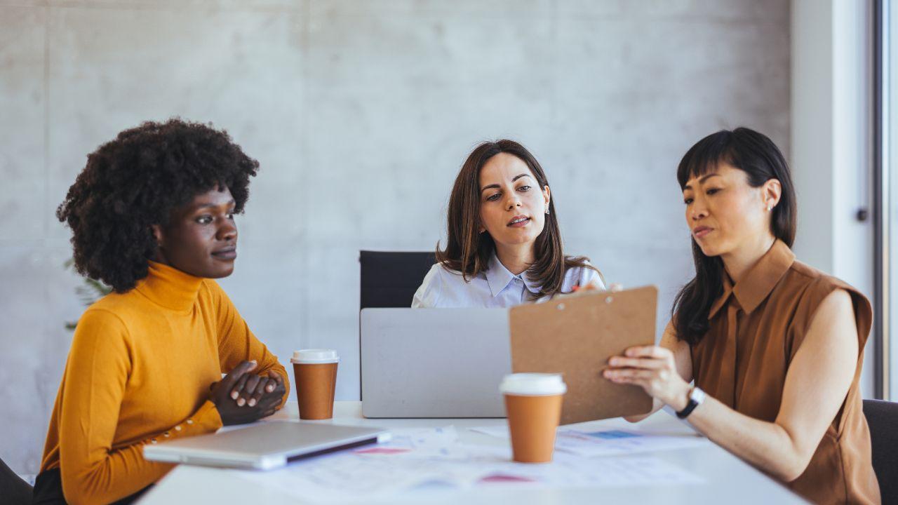 Mulheres sentadas na mesa do escritório mexendo no computador trabalhando.