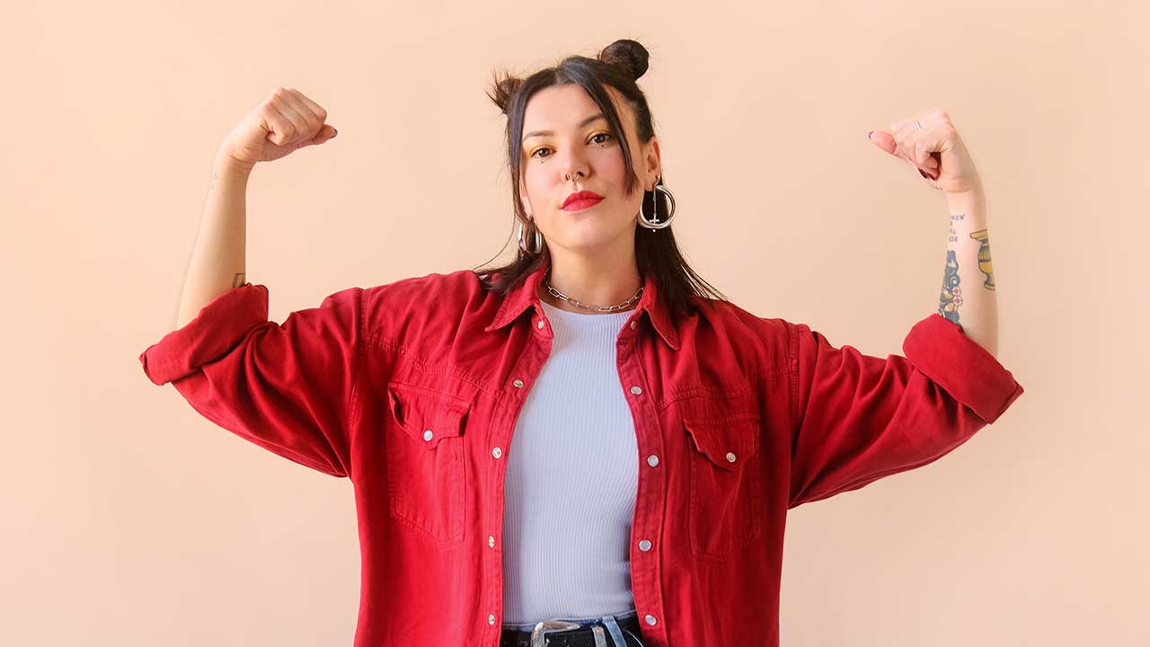mulher mostrando os bíceps e séria em fundo rosé