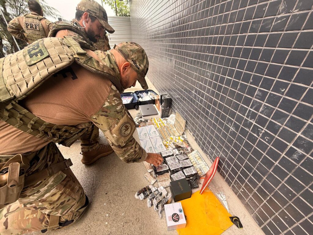 Diante da suspeita de transporte irregular, a equipe aprofundou a fiscalização e encontrou compartimentos adaptados no veículo, preparados para ocultar mercadorias. Nesses espaços estavam centenas de unidades de anabolizantes, incluindo esteroides como Durateston e Deca, além de medicamentos comercializados como emagrecedores, entre eles canetas injetáveis utilizadas para perda de peso. Também foram apreendidos perfumes importados e um relógio estrangeiro.