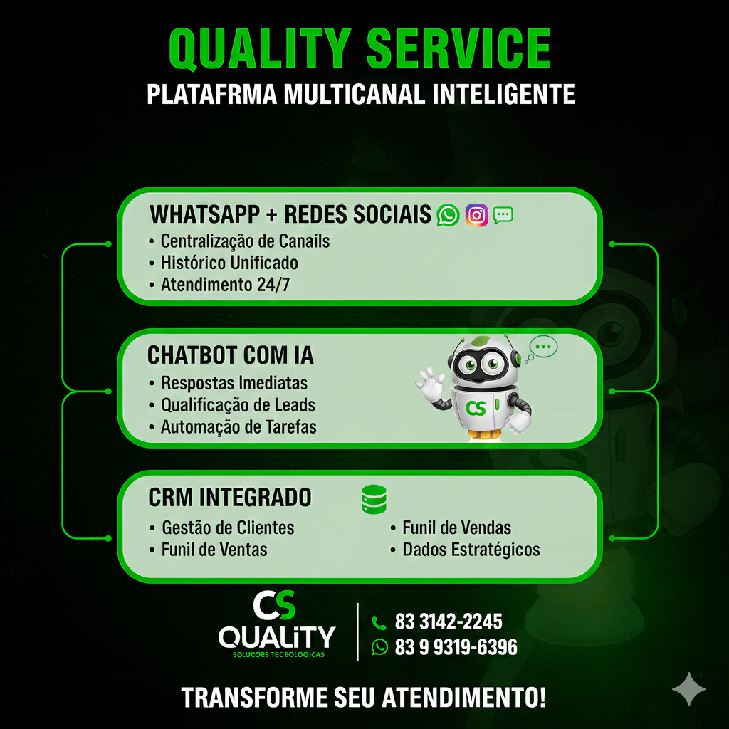A Quality Service entende que cada negócio tem uma digital única. Por isso, não entregamos apenas software, entregamos uma solução estratégica desenhada para escalar sua operação, reduzir seus custos operacionais e, acima de tudo, profissionalizar cada interação com seu público.