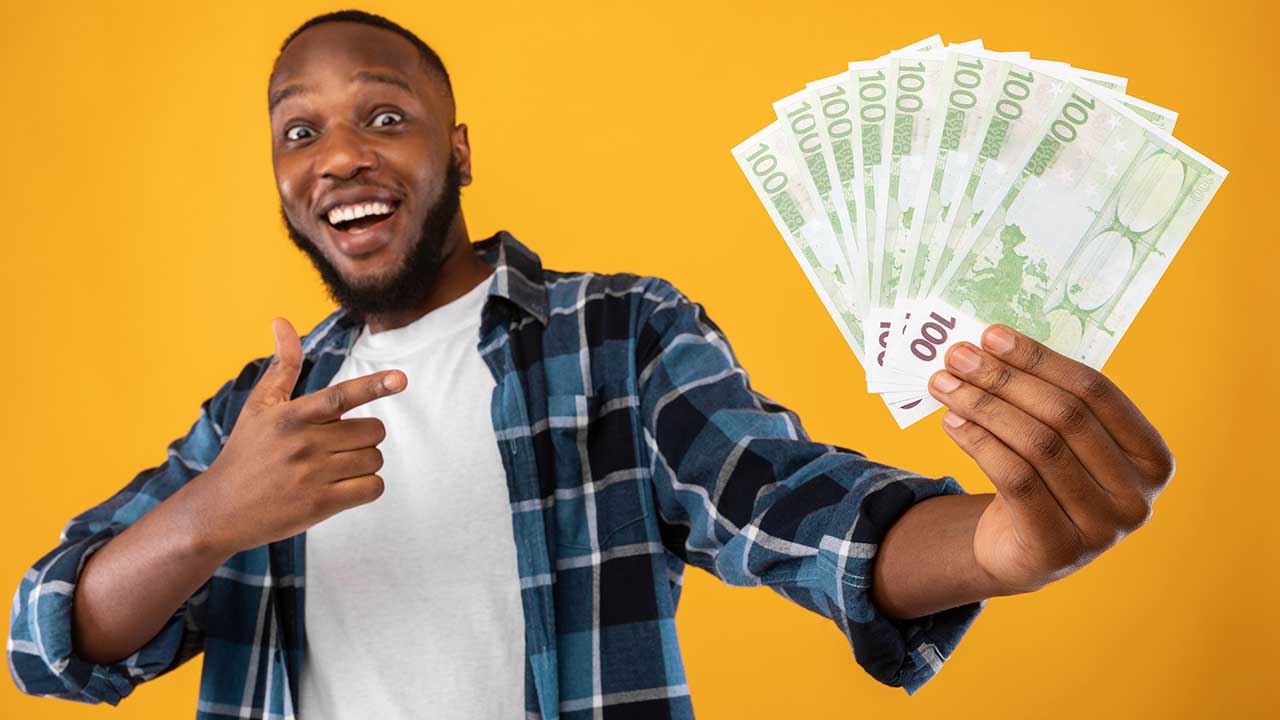 homem sorrindo e apontando para o leque de dinheiro em fundo amarelo