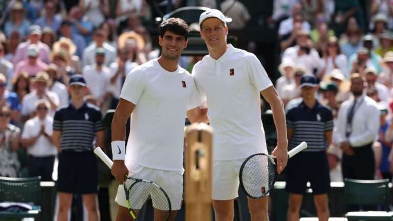 Carlos Alcaraz e Jannik Sinner antes da final entre eles no Grand Slam de Wimbledon de 2025. Julian Finney/Getty Images