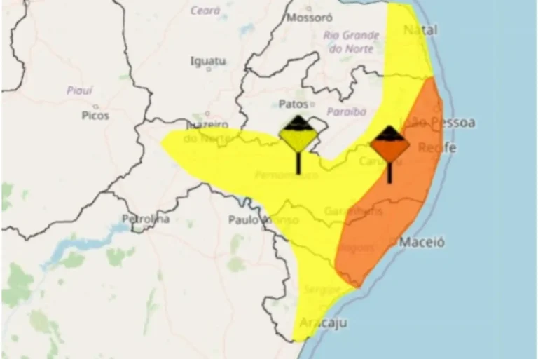 A princípioo, a previsão abrange também Sergipe e Rio Grande do Norte, onde há possibilidade de pancadas moderadas, especialmente em áreas litorâneas. Já em Pernambuco, a chuva deve atingir quase todo o território estadual, incluindo a Região Metropolitana do Recife e o Agreste. No extremo sul da Bahia, também há chance de precipitações, ainda que de forma mais isolada.