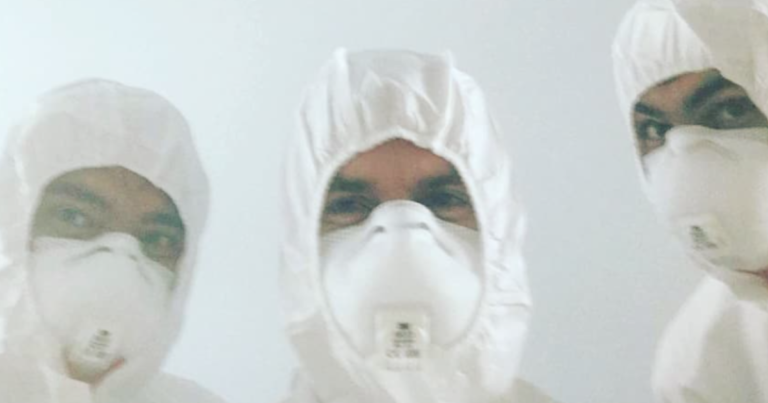 O equipamento de proteção individual (EPI) de quem faz limpeza forense não deixa nenhuma parte do corpo exposta. Para evitar contaminação com resíduos do cadáver, a roupa cobre até a cabeça – é o chamado macacão hazmat (de “hazardous materials”, ou materiais perigosos). Os profissionais também usam máscara, duas luvas (a primeira delas bem fina, coberta pela segunda, mais robusta, presa com uma fita adesiva no punho) e plásticos de proteção sobre os sapatos, a fim de impedir que materiais indesejados grudem na sola.