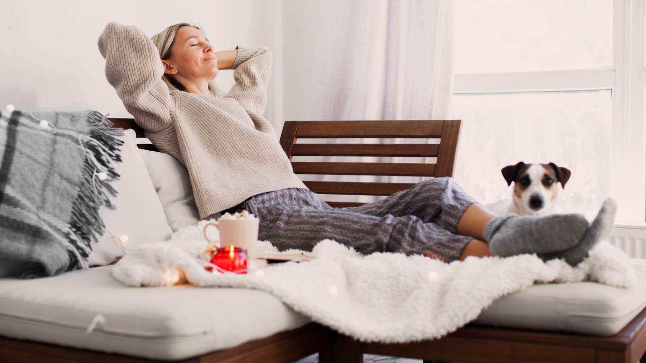 Mulher adulta está reclinada em um banco com almofadas, perto da janela, com os olhos fechados e as mãos apoiadas atrás da cabeça, em postura de relaxamento. Ela usa roupa confortável e meias. Ao redor, há mantas, uma caneca, uma vela acesa e luzes decorativas. Um cachorro pequeno está deitado ao lado dela, observando o ambiente.