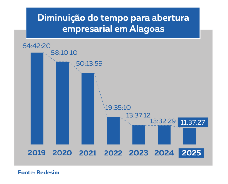 Em 2025, Alagoas atingiu o tempo médio de 11 horas e 37 minutos para abertura de empresas. O número representa o melhor tempo alcançado na história do estado, refletindo em uma diminuição de 14,16% em relação às 13 horas e 32 minutos estabelecidas em 2024. As informações anuais são divulgadas pela Rede Nacional para a Simplificação do Registro e da Legalização de Empresas e Negócios (Redesim), do Governo Federal.