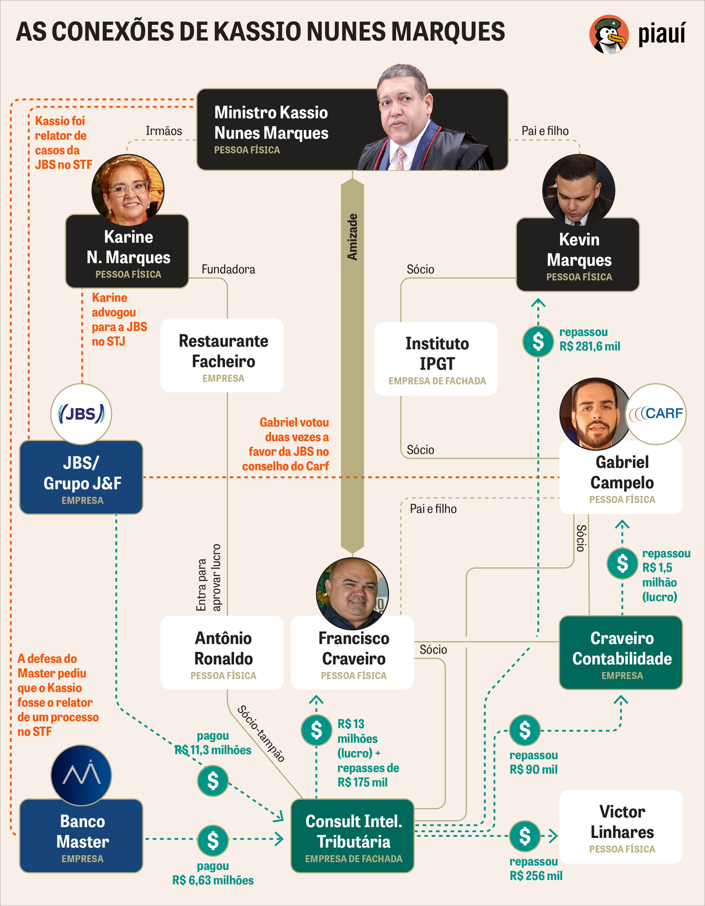 Não existe qualquer evidência direta de relação entre os pagamentos à Consult e a atuação do ministro Kassio Nunes Marques, mas o fluxo de interesses e valores passa tão perto do magistrado que é digno de nota. Já as conexões entre as famílias de Francisco Craveiro, beneficiária de JBS e Master, e de Kassio Nunes Marques, com poder sobre JBS e Master, são sólidas.