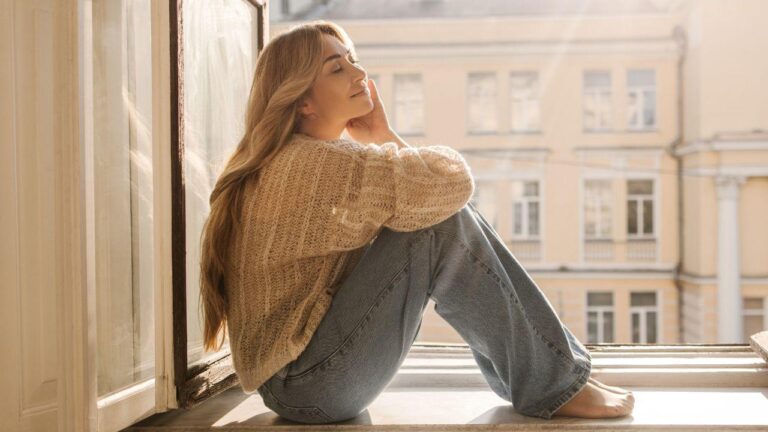 Mulher em momento de autocuidado e respiração consciente para preservar a energia