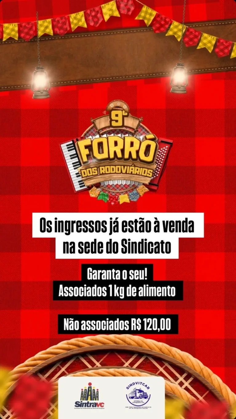 Já estão disponíveis os ingressos para o 9º Forró dos Rodoviários de Vitória da Conquista. O tradicional evento, que celebra a cultura nordestina e valoriza os trabalhadores do transporte coletivo, será promovido pelo SINTRAVC.