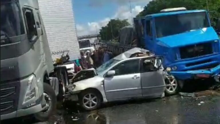 De acordo com as primeiras informações, o carro teve a parte traseira esmagada após uma colisão em sequência com os dois caminhões.