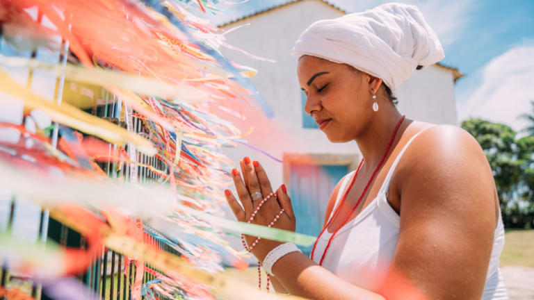 Mulher adulta com turbante branco e roupa clara está de perfil, com os olhos fechados e as mãos unidas em oração. Ela segura contas coloridas entre os dedos e está diante de uma grade decorada com fitas multicoloridas que se movem ao vento. Ao fundo, há uma construção clara sob céu azul, criando um ambiente de fé, espiritualidade e tranquilidade.