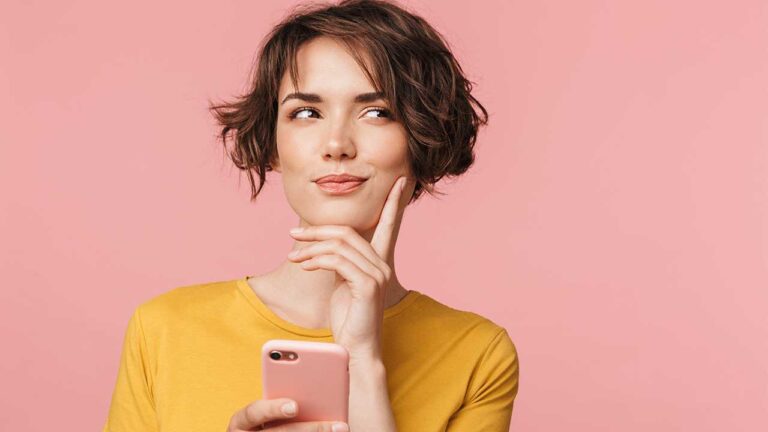 mulher com a mão no queixo e outra mão segurando o celular em fundo rosa