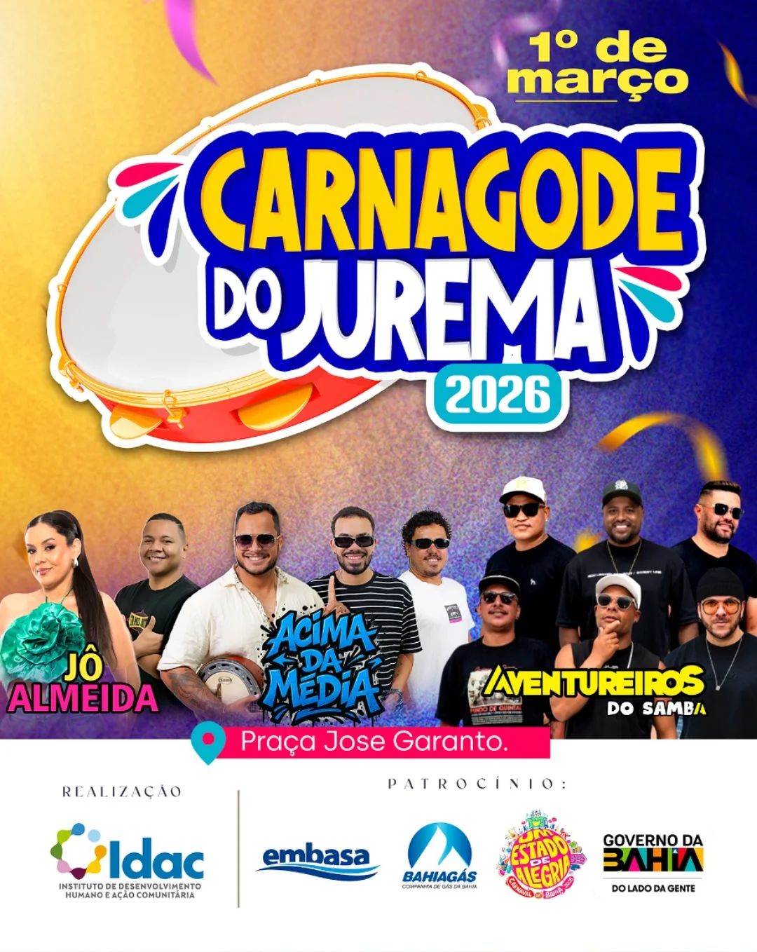 O Carnagode do Jurema 2026 é realizado por Rafael Oliveira em parceria com o IDAC, contando com o apoio dos deputados Fabrício Falcão e Alice Portugal. O evento também recebe patrocínio do Governo do Estado da Bahia, da Embasa e da Bahiagás, reforçando o compromisso institucional com o fortalecimento da cultura e do lazer nas comunidades.