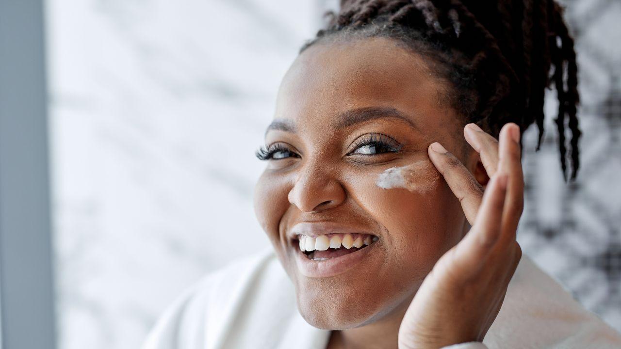 Mulher negra, com trança presa, usando roupão e passando creme no rosto.