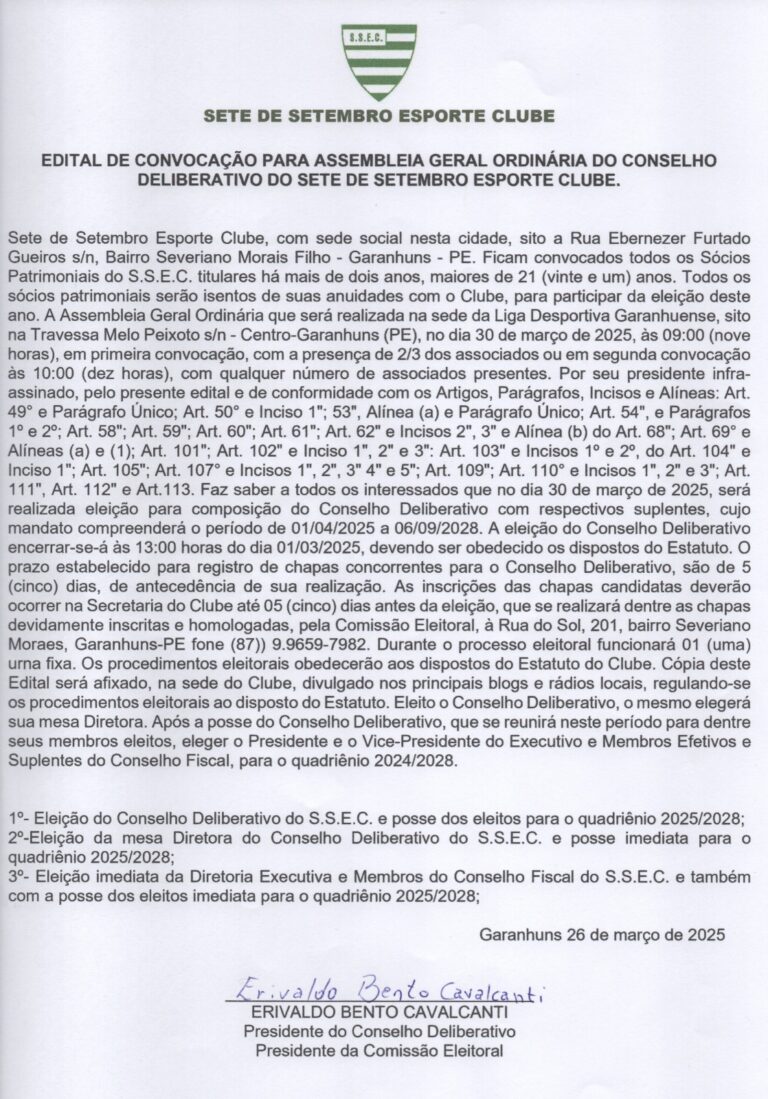 Share WhatsApp Facebook LinkedIn Email Twitter Pinterest Telegram Copy Link O post <h1>Sete de Setembro Esporte Clube convoca Assembleia Geral Ordinária do Conselho Deliberativo<h1> <h3 style='color:#898989;font-size:14px;'>Reunião discutirá temas administrativos e estratégias do clube para a próxima temporada.</h3> apareceu primeiro em PE News. Source link