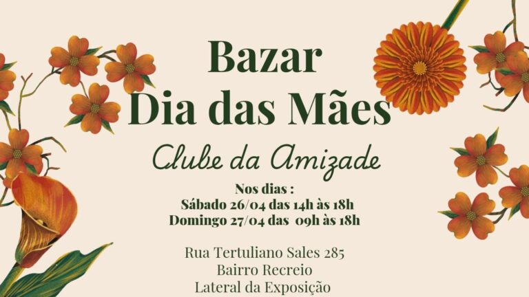 Em clima de celebração e solidariedade, o Clube da Amizade realizará um Bazar Especial de Dia das Mães neste final de semana. O evento acontecerá nos dias 26 e 27 de abril, na Rua Tertuliano Sales, nº 285, bairro Recreio, na lateral do Parque de Exposições.
