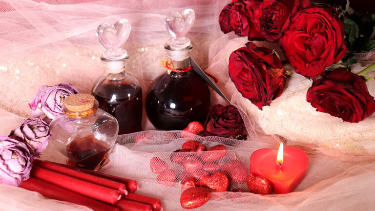 velas vermelhas e objetos de simpatias para amor em um fundo claro