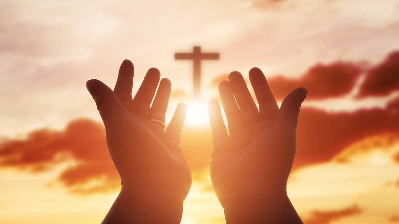 imagem de um par de mão elevados ao alto com um cruz acima de um céu nascendo em um fundo laranja