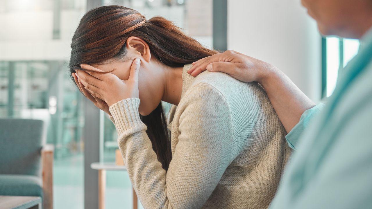 Imagem de uma mulher com as mãos no rosto sendo confortada por outra pessoa