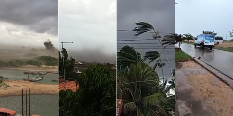 Moradores registraram vídeos com celulares que mostram a intensidade da chuva e dos ventos, além dos estragos causados pelo temporal na região.
